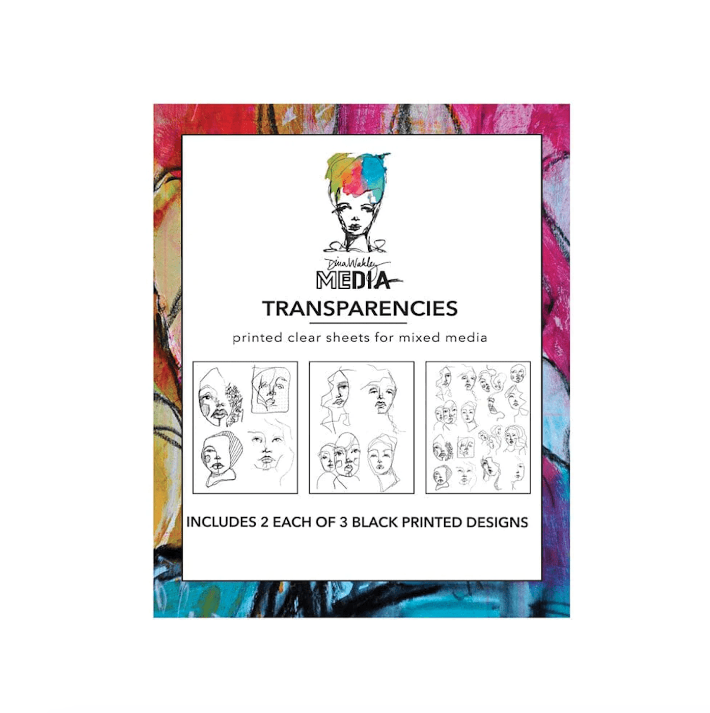 Dina Wakley MEdia Transparencies include 6 sheets of 8.5 x 10.75" (21.59cm x 27.3cm) clear sheets printed with black designs. Featuring Dina's signature artwork, they are ideal for collaging into mixed media and journal pages. Includes 2 each of 3 black printed designs.