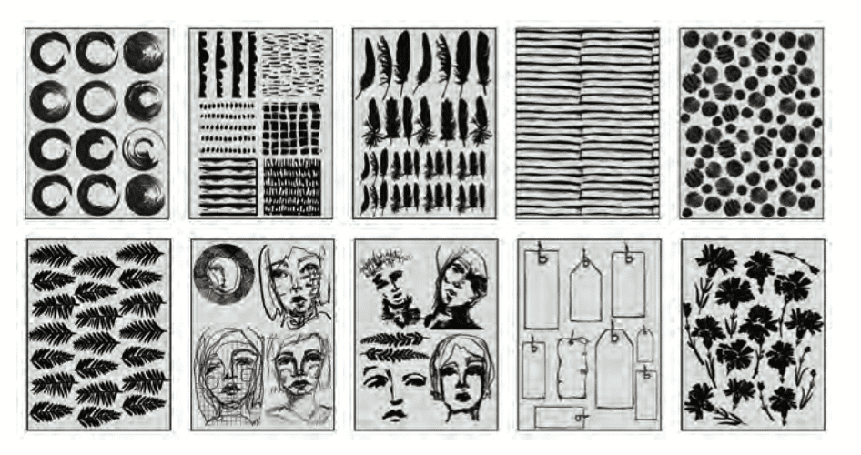 Dina Wakley MEdia Collage Paper includes tissue that features Dina’s signature artwork printed in black. Ideal for collaging into mixed media and journaling pages. Cut up or use as is, these collage papers are sure to add a bold pop to mixed media projects. Elements Collage Paper includes 20 sheets of 7 1⁄2” x 10” 2 each of 10 printed black.