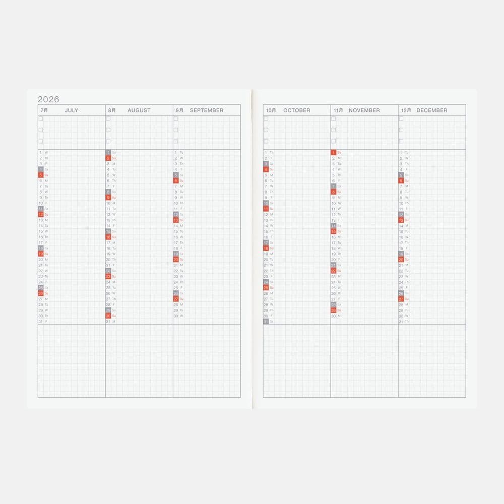 After years of testing, the graph paper has been set to 3.7 mm for optimal writing comfort. The graph paper design allows users to write from any starting point on the page, and the lines have been printed in light colors so users can either customize it to their own layout or ignore it completely. Like with the Japanese version, each month is printed in a different color.