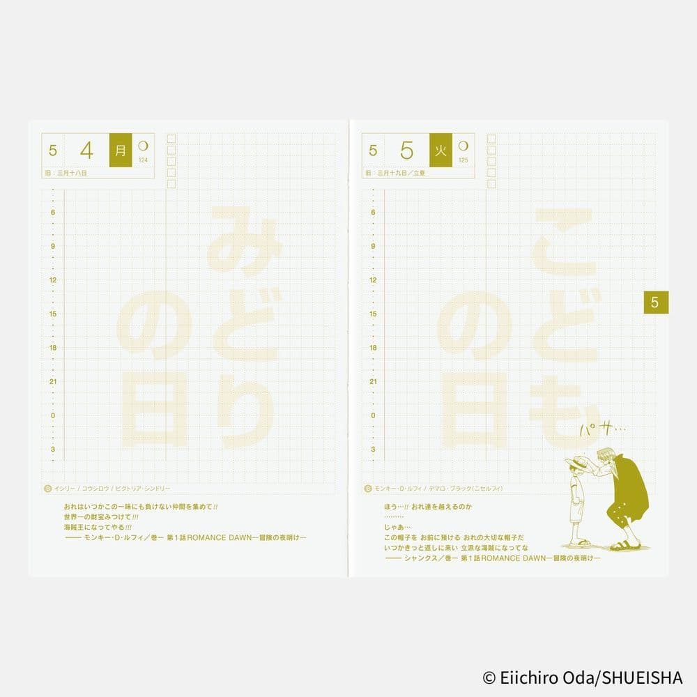 The cover is red in the image of the protagonist Monkey D. Luffy, and designed with an illustration depicting him, as well as the logo of the ONE PIECE magazine. The book’s lay-flat binding and thin and light Tomoe River graph paper with 3.7 mm squares make the book easy to read and write in. The book includes a yearly calendar, yearly index, Monday-start monthly calendars, daily pages, blank memo pages and more.