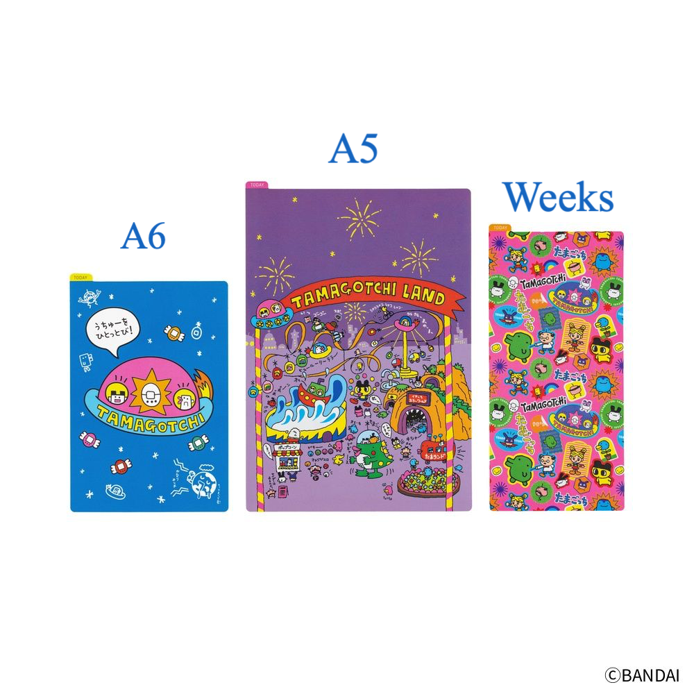 The A5 size Tamagotchi Land is printed with an illustration of this theme park filled with the charm of the Tamagochi world from the 90’s. On the back, a Hyururun UFO is flying across a blue background.