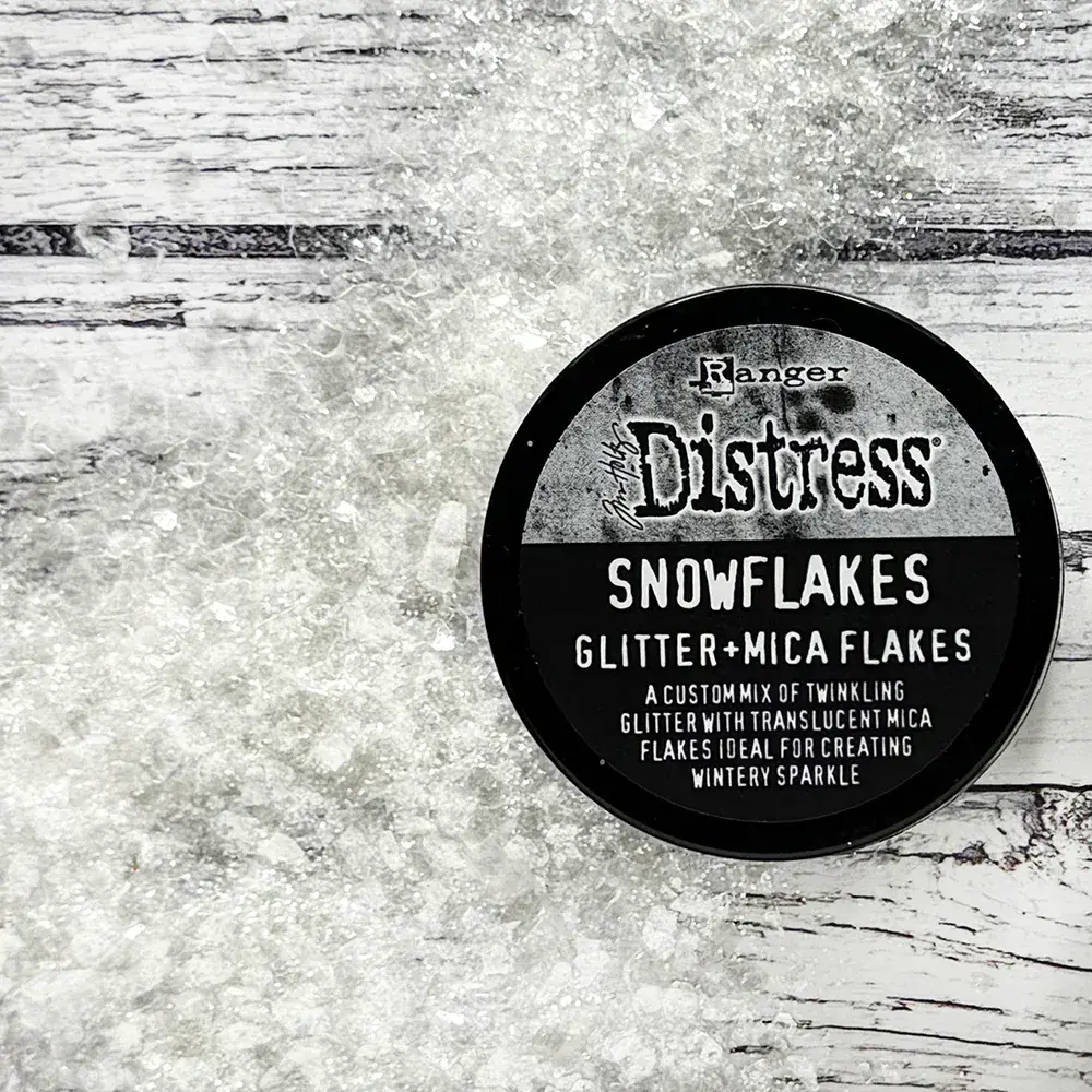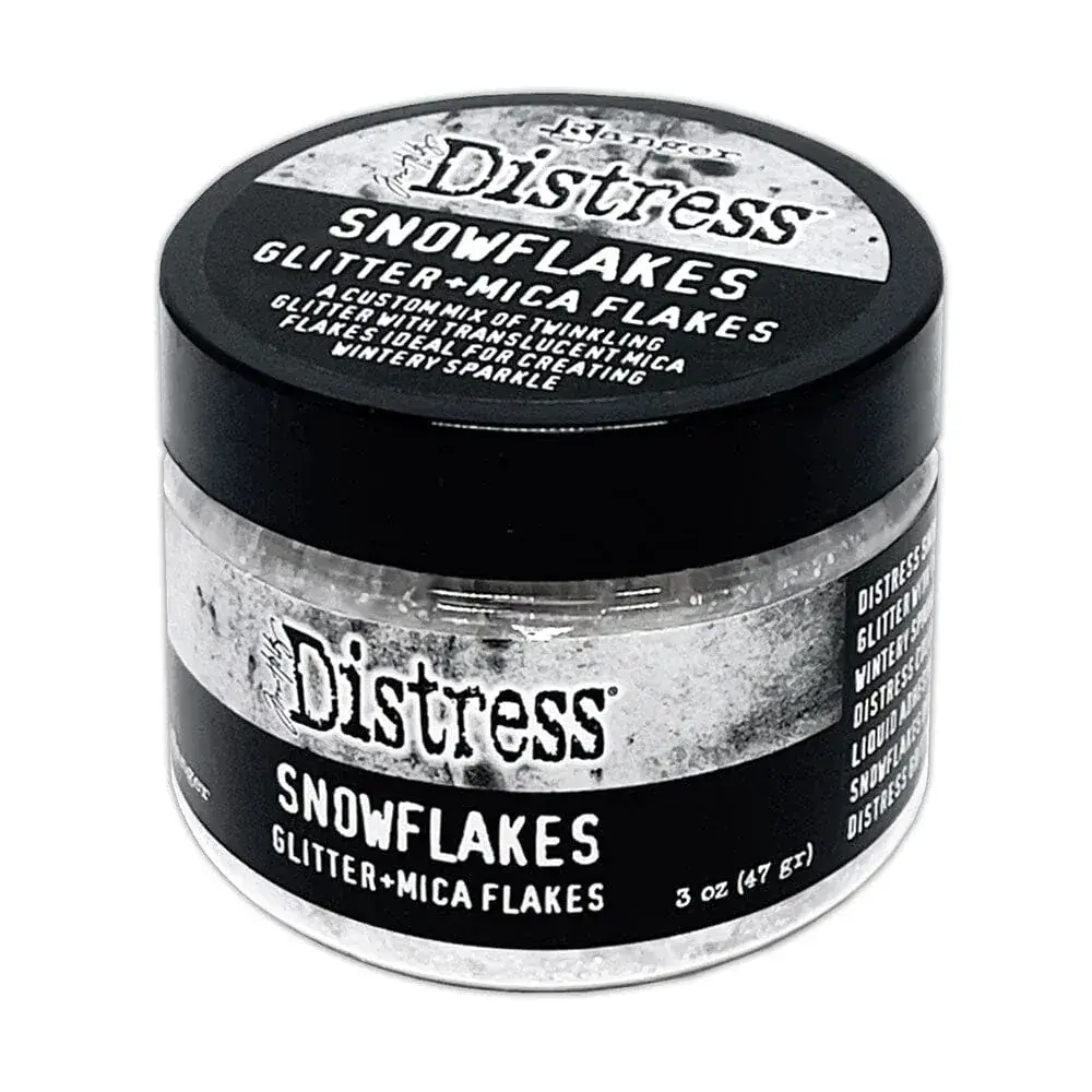 Tim Holtz Distress® Snowflakes combines a custom mix of twinkling glitter with translucent mica flakes for a nostalgic wintery sparkle. Adhere Snowflakes with Distress Collage Medium, Ranger Glossy Accents, or other liquid adhesives. For more dimensional effects, apply snowflakes over wet Distress Texture Paste or Distress Grit Paste and allow to dry.