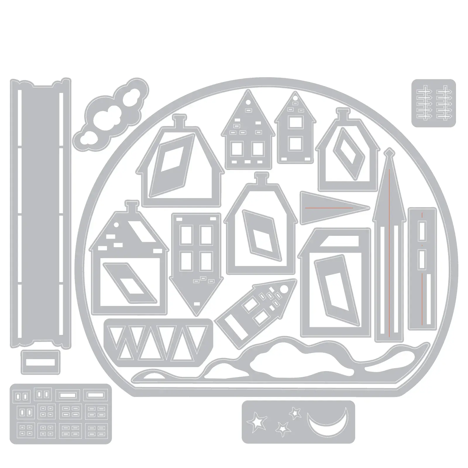 Create winter wonderlands with the Thinlits Die Set 26PK - Snowglobe #2 by Tim Holtz! This charming set of 26 dies lets you craft beautiful snow globes filled with festive details, perfect for adding a magical touch to your holiday cards, ornaments, and decorations. From a snowy sky to charming houses, this set has everything you need to design your own frosty scenes. Let the snow fall and your creativity soar with this must-have set for your winter crafts!